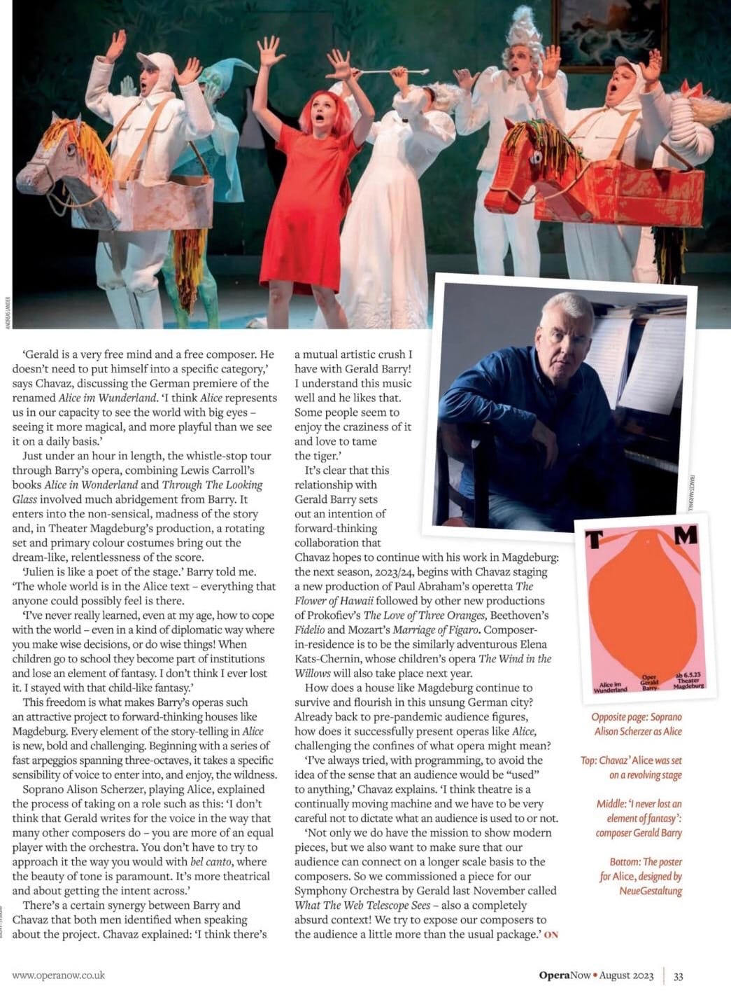 Theater Magdeburg's production of Gerald Barry's opera Alice's Adventures Under Ground was recently featured in the August issue of Opera Now Magazine.